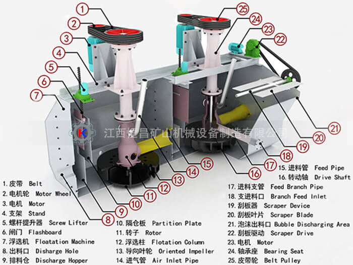XJK(A型)浮選機(jī)設(shè)備主要由轉(zhuǎn)子、導(dǎo)向葉輪、隔倉板、刮板器、刮板驅(qū)動(dòng)等部分組成。