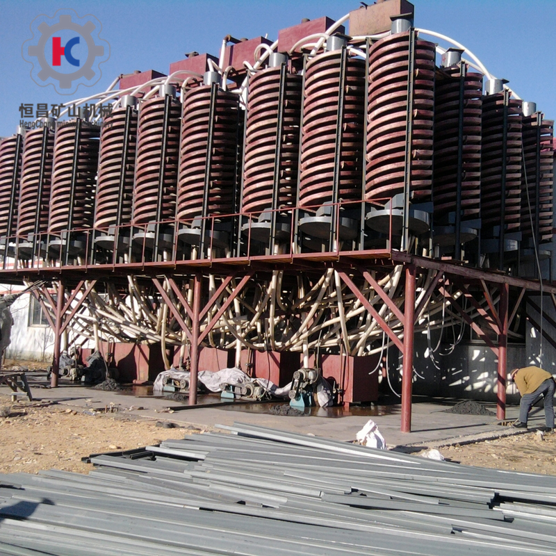 Spiral Chute is to make separations of useful minerals from gangues by use of the different particles subject to gravity, hydraulic pressure and friction in the multi-force field through dynamic centrifugal flowing membrane of slurry produced on the inclined surface of spiral based on the differences of useful mineral and gangue in specific gravity, particle size and shape. Water in the spiral chute runs downward spiral movement and also flows in circulation transversely. Water in the upper layer run fast, generating centrifugal force with large inertia to toss toward the outer edge of the chute. Back-flow of water in the lower layer adjacent to the chute bootom runs slowly with small centrifugal force and flows from the outer edge to the inner edge with the action of gravity, generating secondary back-flow. Particles of heavy minerals in slurry settle rapidly and gradually moves toward the inner edge along the converged helix prior to finally being produced as concentrate. Light minerals settle slowly and flow fast in the surface layer of ore flow with large centrifugal force and gradually move toward the outer edge along the expanding helix before finally being produced as tailings.
