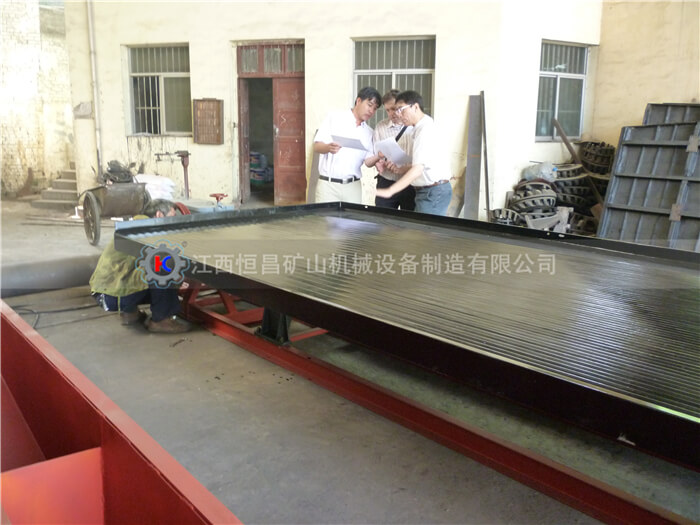 最近研究了一種液壓傳動的新型搖床,可用于粗粒、細粒和超細粒物料的重選。由于這種搖床的往復運動可按需要選擇,因此它既適合粗砂分選,也適合處理礦泥。該設備結構經專門設計,床面加速度可高達6~7g,且不傳輸至下面機架,所以廠房建筑基礎和結構不會受到動力的影響。床面用蜂窩狀結構的輕型鋁夾層板制成,由于來復條床面澆注成一個整體件,非常堅固,可以避免變形。床面安放在完全無需維修的空氣緩沖墊上。床面傾角在工作時用一個小液壓缸調整。床面由電子控制的液壓缸驅動。與機械傳動裝置相比,前進速度高,且能急劇減速,逆向加速度較低。由于縱向搬運的速度快,因此每張床面可以獲得的固體生產能力較常規搖床高得多。介紹了不同給料的試驗廠的分選結果。